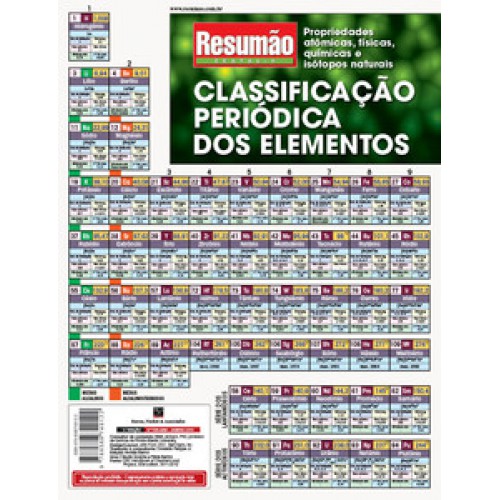 Versão estendida da tabela periódica, o Resumão Classificação periódica dos elementos traz as informações indicadas por códigos de cores, para facilitar a consulta. Seu conteúdo está organizado de maneira que você possa encontrar rapidamente as respostas para as suas perguntas e os temas de seu interesse: propriedades atômicas, físicas, químicas e isótopos naturais dos elementos, número atômico, peso atômico, raio iônico, eletronegatividade, raio atômico e afinidade eletrônica são algumas das informações dos elementos. Direto ao ponto, fácil de guardar, ótimo para aprender e relembrar para as provas.