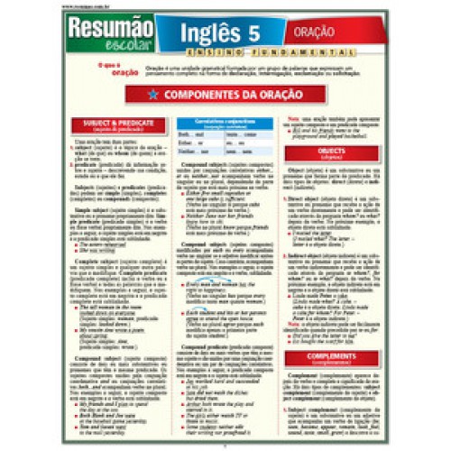 Último título da série de inglês da coleção Resumão Escolar, este guia aborda os componentes da oração: sujeito, predicado, objetos, complementos, oração, frase e sentença, finalidade das orações e convenções gramaticais, como o uso de letras maiúsculas e a pontuação na língua inglesa.