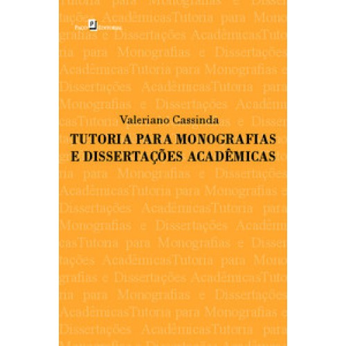 Tutoria para Monografias e Dissertações Acadêmicas, de autoria de Valeriano Cassinda, tem como objetivo principal, busca auxiliar, alunos, professores, tutores e leitores a entender o processo de escrita do tão temido Trabalho de Conclusão de Curso (TCC) e também da monografia, considerando o contexto de pesquisa científica na Angola. Ao longo dos setes capítulos os quais a obra se divide, o ator deseja mostrar qual o real papel de um orientador (tutor) de um TCC e como ele deve auxiliar o aluno em seu cronograma e em sua escrita do trabalho, além do papel do estudante e as informações técnicas de escrita que ele deve dominar.