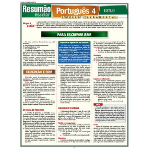 Português 4 é um guia feito para ajudar o aluno a escrever bem. O que é estilo, elocução e tom. Como deve ser feita a escolha das palavras e os tipos de linguagem. Como as palavras se organizam no texto, o ritmo e os tipos de período que se pode adotar. No final, dicas sobre o uso apropriado da pontuação para deixar o texto claro e fácil de ser entendido.