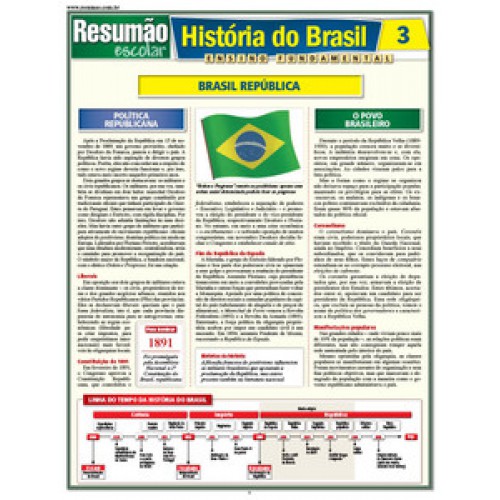 Os principais acontecimentos da história republicana brasileira foram divididos em dois Resumões. História do Brasil 3 aborda o primeiro período, desde a proclamação da República até o golpe militar de 1964. A política republicana, a Constituição de 1891 e o fim da República da Espada, o coronelismo, as manifestações populares, a remodelação do Rio e a revolta da Chibata, a economia complexa, o drama de Canudos, a imigração em massa, o movimento operário, o tenentismo em ação, a revolução de 1930, o Estado novo, os problemas da economia, o movimento socialista, a democracia populista e o Período JK. E mais: os anos de crise, o parlamentarismo e o golpe de Estado.