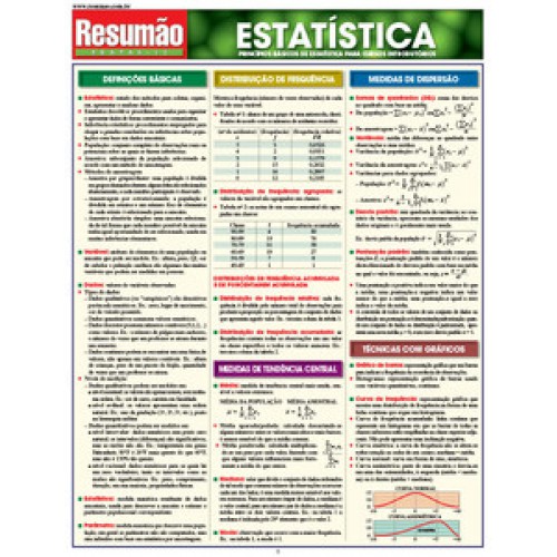 Este é um guia prático de estatística. Ele traz os principais conceitos explicados de forma clara e direta e acompanha a trajetória profissional de seus leitores. Serve aos estudantes que precisam entender a matéria e aos profissionais que querem relembrar informações. Escrito e revisado por especialistas, seu conteúdo está organizado de maneira que você possa memorizar as definições com facilidade e encontrar rapidamente as respostas para as suas perguntas e os temas de seu interesse, sem abrir mão da qualidade das informações. Princípios básicos de estatística, distribuição da frequência, medidas de tendência, técnicas com gráficos, probabilidade, variáveis aleatórias, inferência estatística e desvio padrã o da média estão entre os assuntos abordados. Direto ao ponto, fácil de guardar, ótimo para aprender e relembrar para as provas.